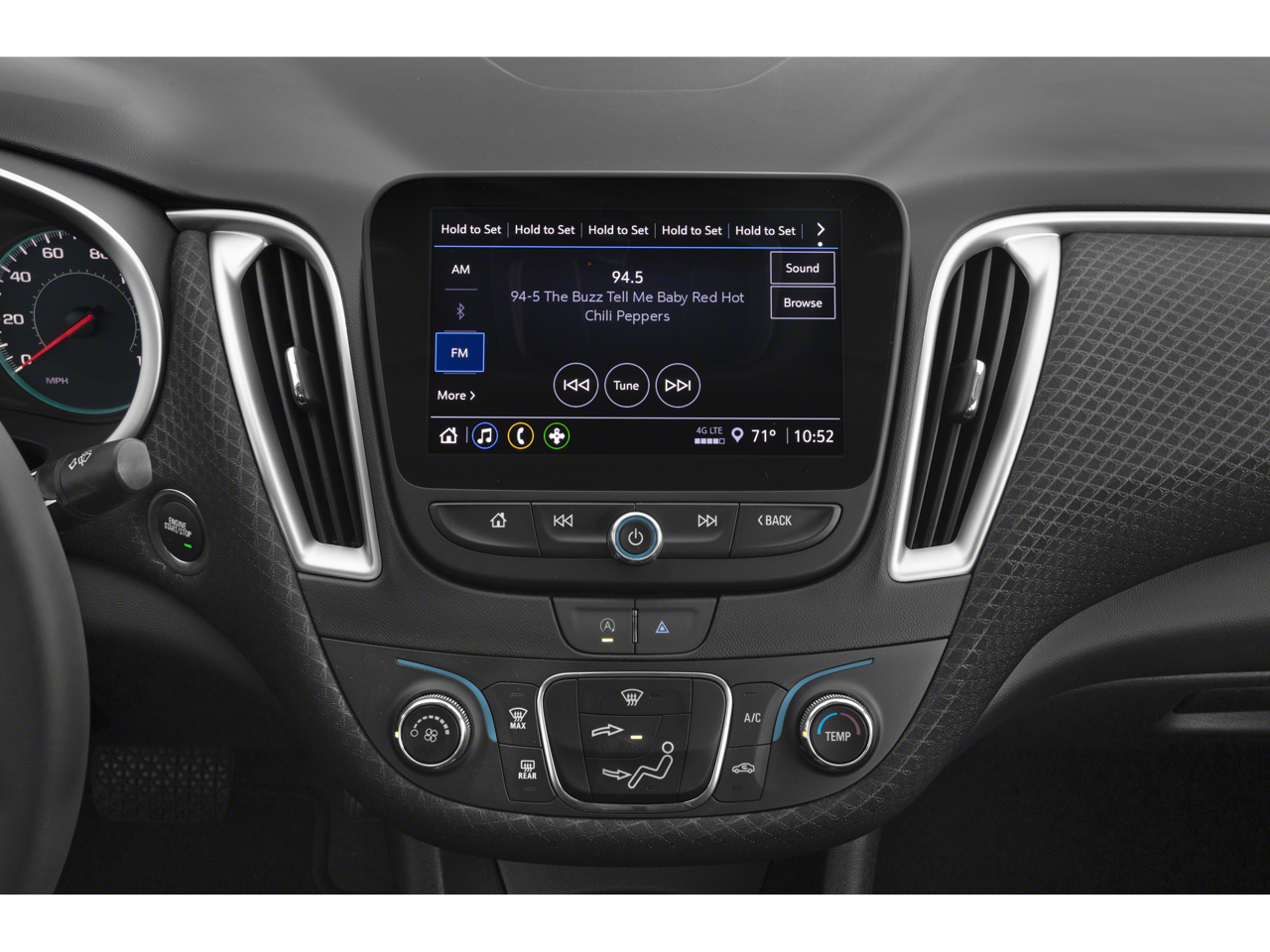 - Audio system, Chevrolet Infotainment 3 system, 8" diagonal color touchscreen, AM/FM stereo. Additional features for compatible phones include: BluetoothĀ® audio streaming for 2 active devices, voice command pass-through to phone, Apple CarPlay and Android Auto capable.