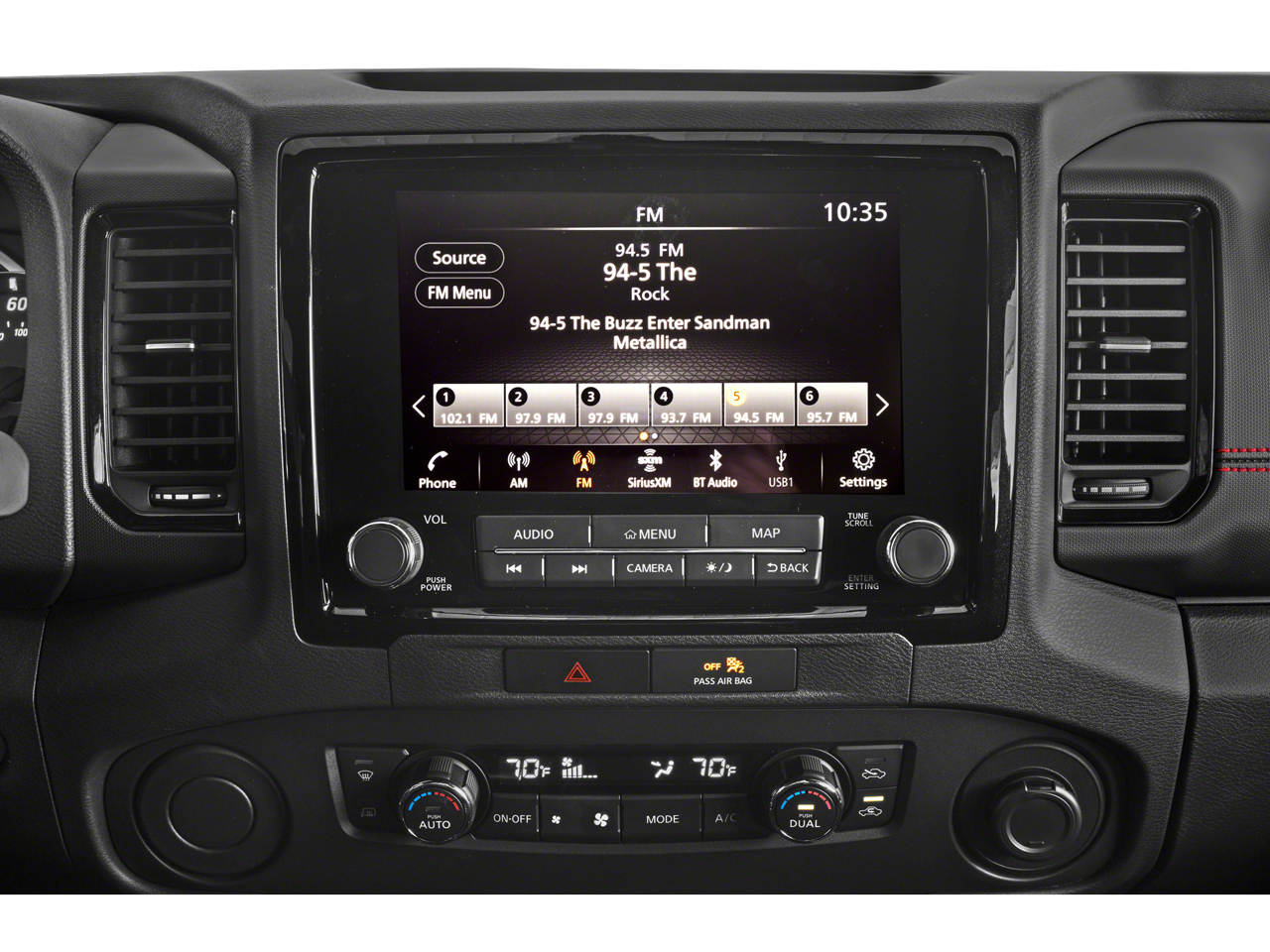 - Radio: 1CD/SXM/AM/FM/AUX/USB/MP3/WMA Audio System -inc: 6 speakers, 9.0" color touch-screen display, wireless Apple CarPlay, Android Auto, BluetoothĀ® hands-free phone system and streaming (audio or text message), voice recognition for audio features, Siri Eyes Free, SiriusXM radio w/advanced audio features, 1 USB-A and 1 USB-C front ports, steering wheel audio controls, Nissan door to door navigation, electronic compass in navigation, NissanConnect services and Wi-Fi hotspot